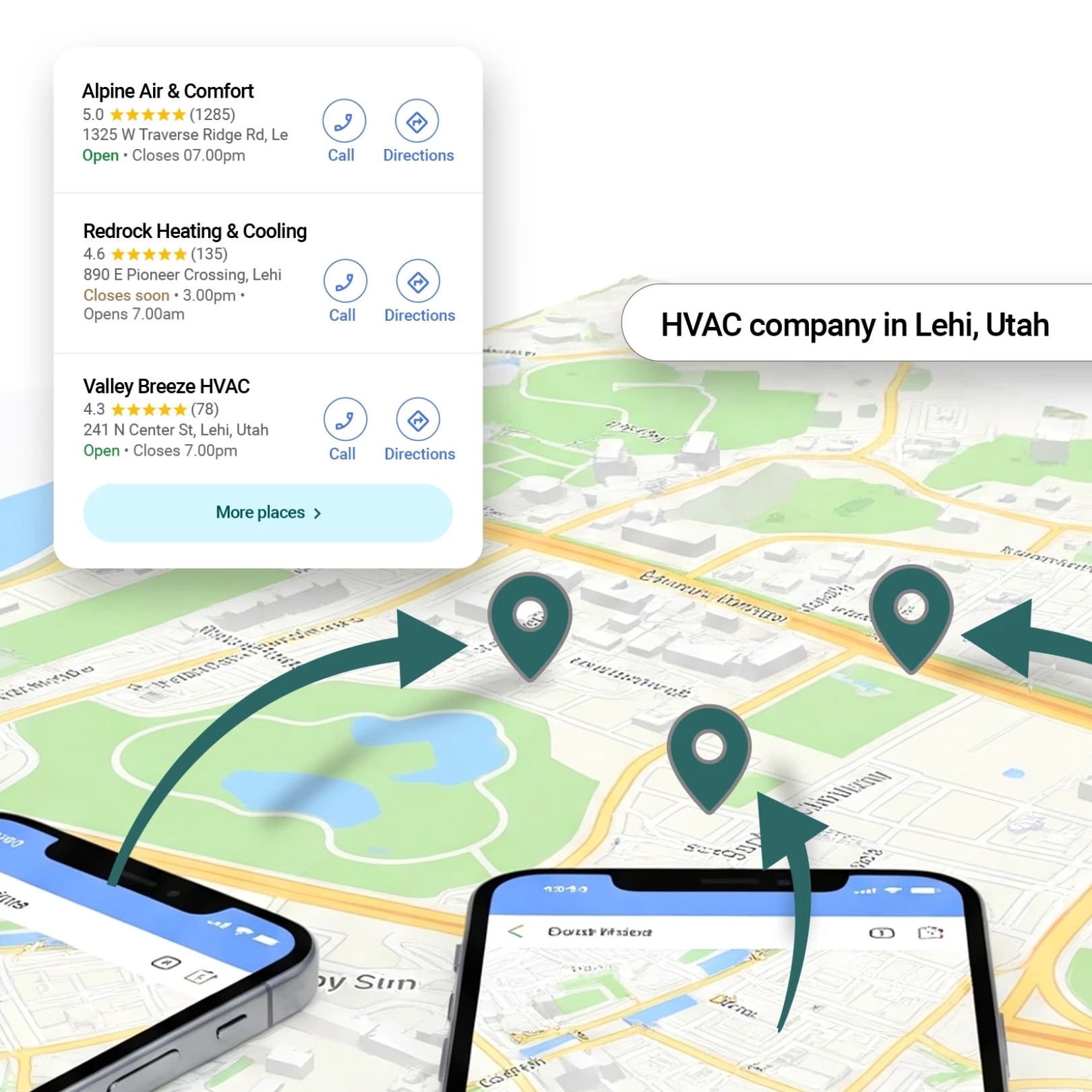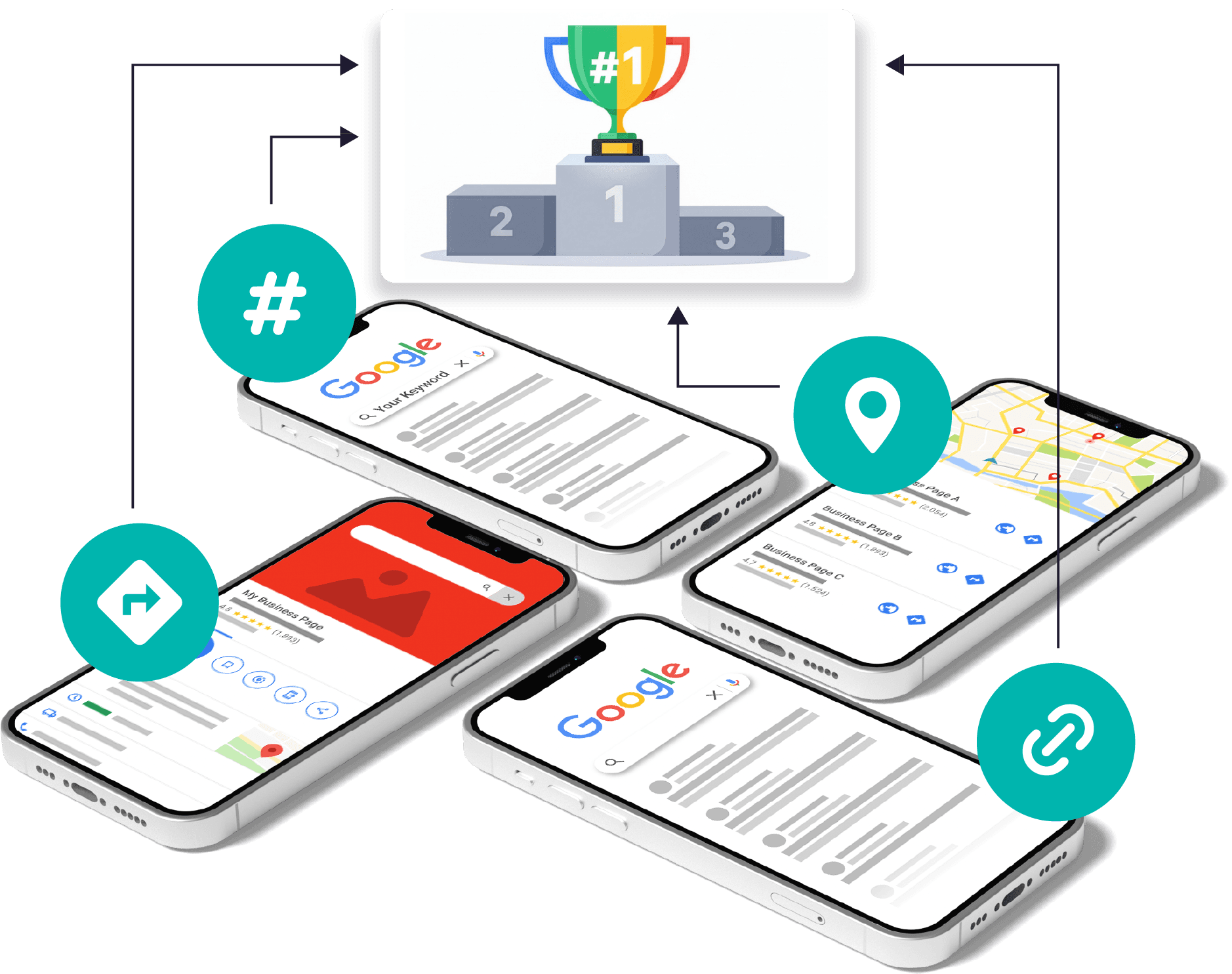 Our patent-pending Real Device Network uses thousands of physical mobile devices to perform targeted Google searches within your area — sending real, local search activity to Google. This accelerates rankings and appears in your weekly heatmap reports, showing exactly where visibility is increasing.